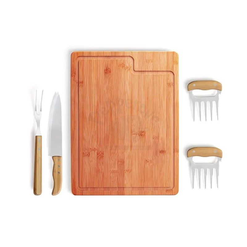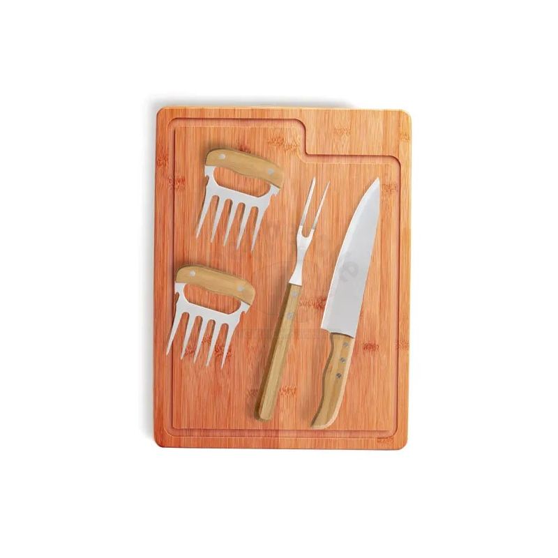 Conjunto para Churrasco em Bambu/Aço Inox. Conta com tábua em Bambu; Faca 8'', garfo trinchante e 2 garfos 5 dentes com abridor de garrafa em Bambu/Inox.
