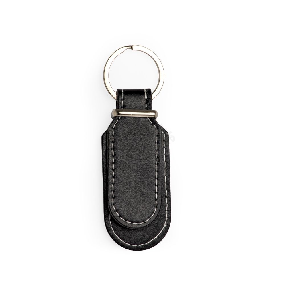 Chaveiro de couro sintético com detalhe em metal e frente e verso lisos.