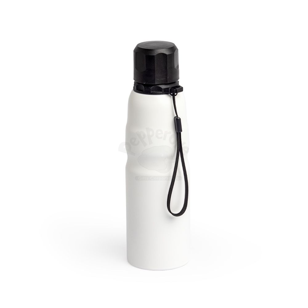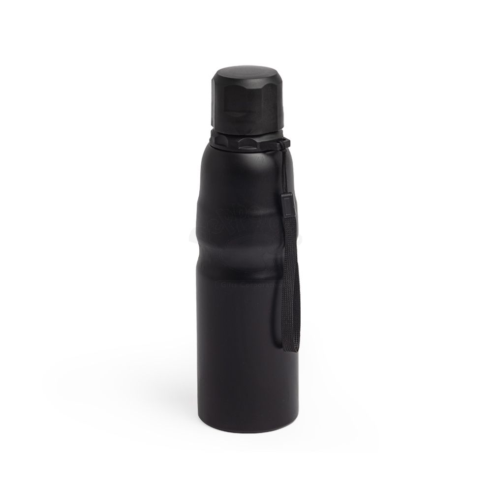 Garrafa inox 800ml com tampa plástica rosqueável e cordão para transporte.