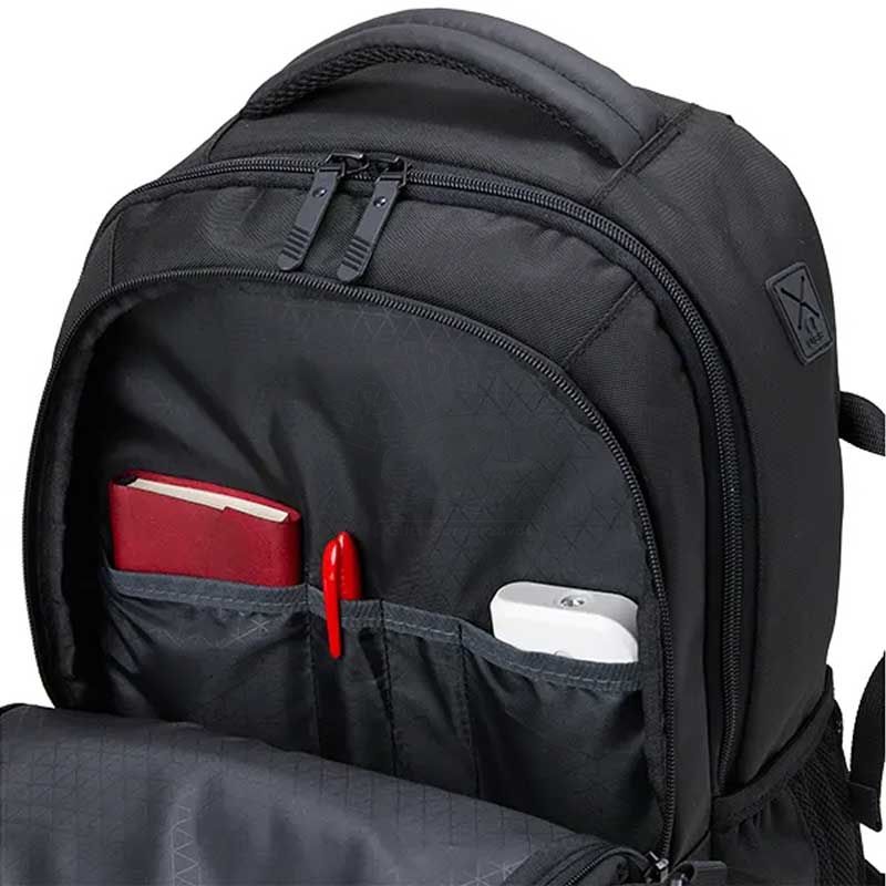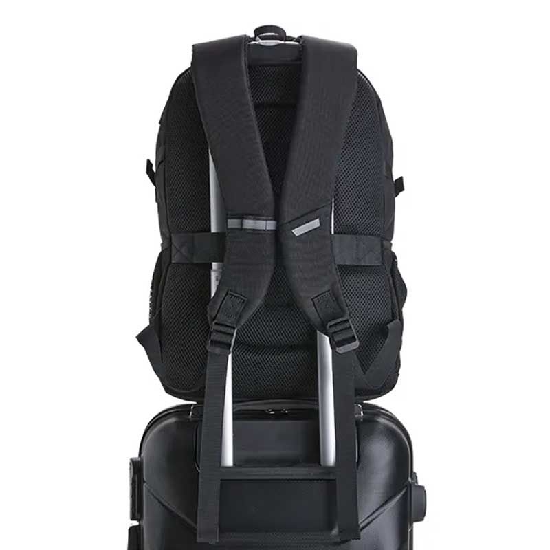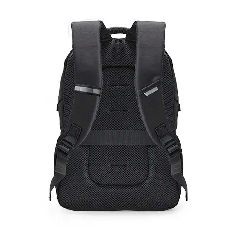 Mochila preta em Polyester / PU. Conta com alças para as costas com faixa refletiva e bolso, alça para as mãos, alça para pendurar e alça carona para mala. Na parte externa conta com saída para fio, faixa refletiva, borrachão, dois fechos laterais, dois bolsos laterais com tela, bolso frontal e dois bolsos na parte superior com fechamento em zíper. Na parte interna do primeiro bolso, conta com 4 compartimentos. No bolso principal, conta com compartimento aveludado para notebook e mais um compartimento.
