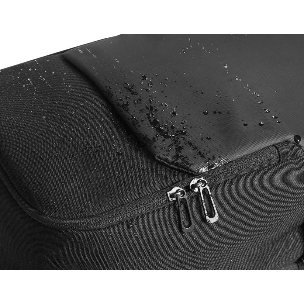 Mochila 2 em 1 com bolsa térmica que permite a sua utilização em conjunto ou separado. Mochila em 900D poliéster reciclado (100% rPET) com bolso e fundo em 600D, poliéster reciclado (100% rPET), de alta densidade com revestimento resistente à água. A mochila é totalmente almofadada e tem interior forrado em 210D poliéster reciclado (100% rPET). Possui 2 compartimentos principais: um compartimento traseiro almofadado para notebook até 17.3” e um compartimento frontal espaçoso com divisória amovível que permite arrumar a sua bolsa térmica no fundo (inclusa). Bolso frontal com zíper e detalhe refletor. Bolso lateral ideal para transportar a sua squeeze e parte posterior com acolchoamento extra e alça para trolley. Capacidade até 20 L. A bolsa térmica almofadada em 900D rPET com isolamento em PEVA. Capacidade 4,5 L.