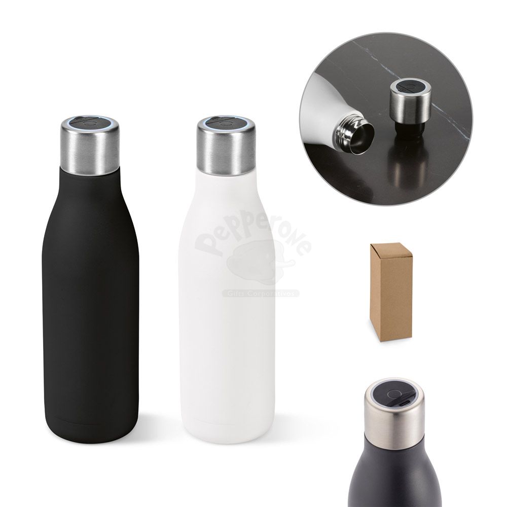 Garrafa em aço inox (90% reciclado) de parede dupla térmica, isolada a vácuo. Garrafa com sistema de auto-sanitização UV que inativa vírus e bactérias que estejam na sua garrafa, tornando a sua bebida mais segura. Capacidade até 500 mL. Preserva as bebidas quentes por 5h e frias por 15h, aproximadamente. Caixa branca 94657 vendida opcionalmente. Certificação EU Food Grade.