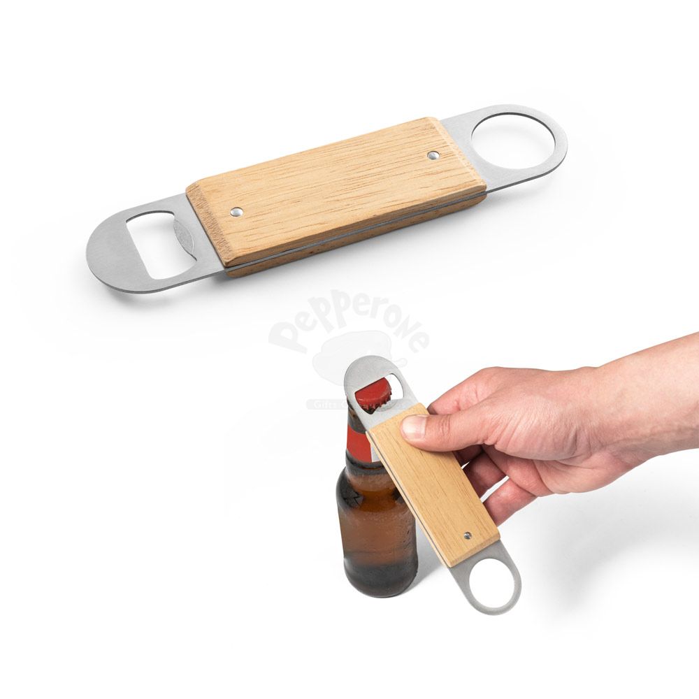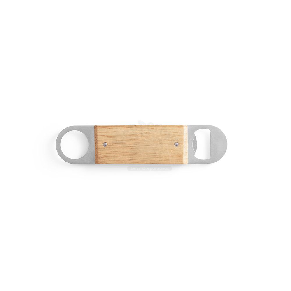 Abridor de garrafas em aço inox com corpo em madeira de faia. Distintivo dos restantes por conter um abridor de um lado e uma argola para facilitar sua arrumação. A cor e o resultado da impressão nos materiais naturais pode variar entre produtos.