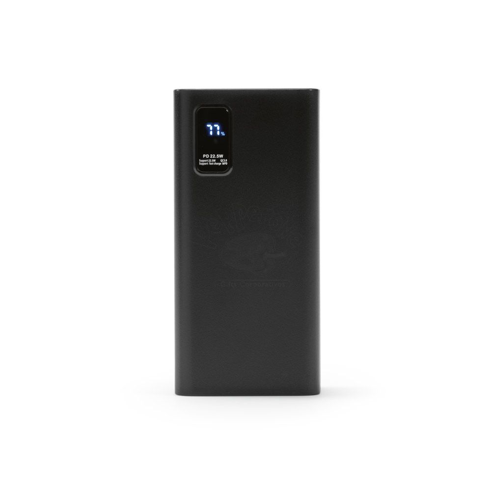 Bateria portátil em ABS 100% reciclado. Bateria em lítio com capacidade de 30.000 mAh e tempo de vida ≥ 300 ciclos. Possui entrada micro-USB e USB-C, 4 saídas USB-A e uma saída USB-C. A parte frontal tem uma tela de LED com informações do nível de carga da bateria. Incluso cabo USB-C para carregamento da bateria. Fornecida em caixa presente de papel kraft.