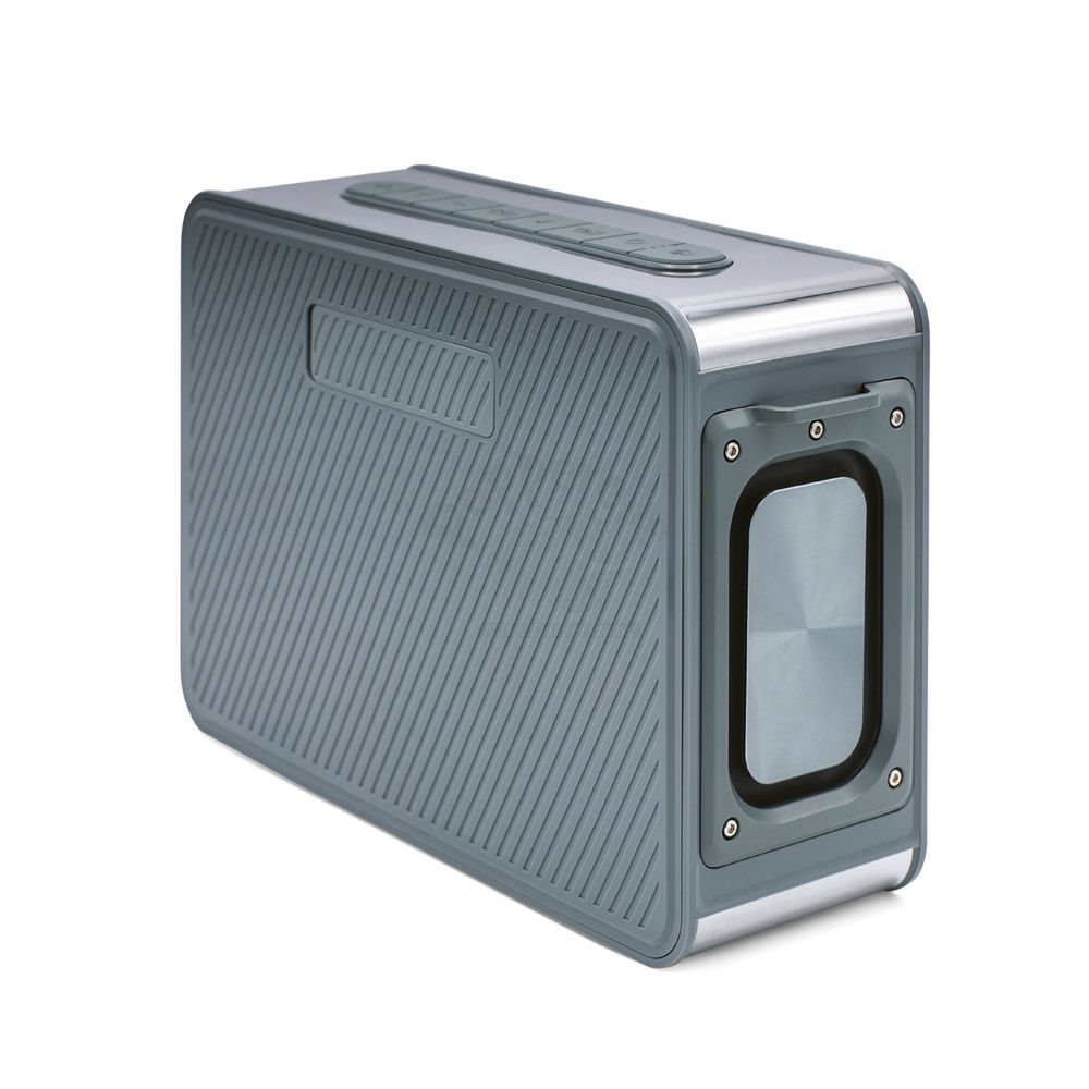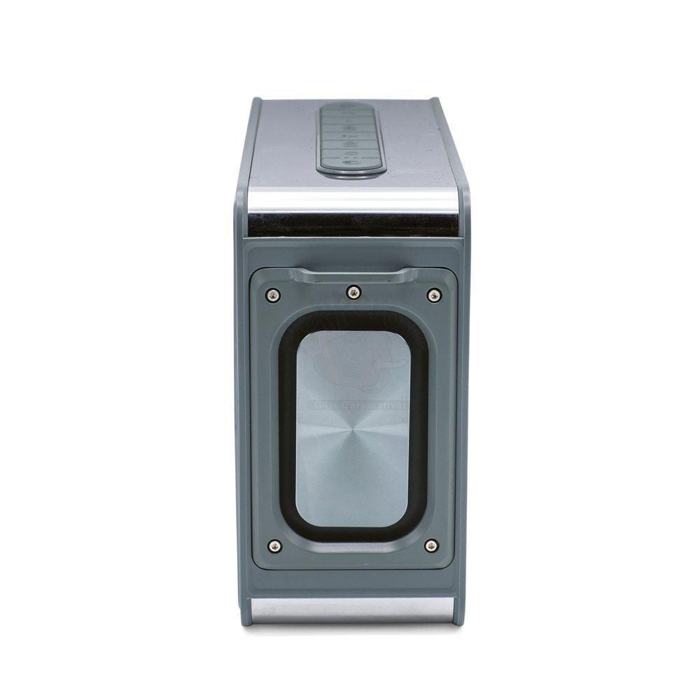 Caixa de som em ABS 100% reciclado com 80W de potência. A capacidade da bateria é de 5.200 mAh, o que permite uma autonomia aproximada de 7h. Tem equalizador com 3 modos, transmissão BT 5.3, entrada e saída AUX e permite ligar microfone externo ou guitarra diretamente. Possibilidade de emparelhar duas caixas de som Jouncer para efeito stereo. Incluso carregador e uma alça para transporte da caixa de som ao ombro. Fornecido em caixa presente de papel kraft.