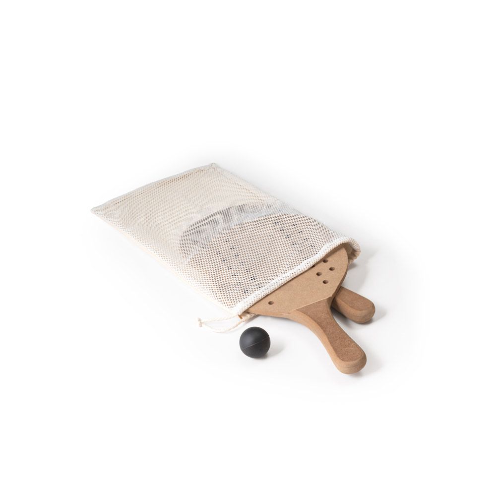 Raquetes de praia em MDF com bola inclusa. Fornecidas individualmente num saco em 100% algodão.