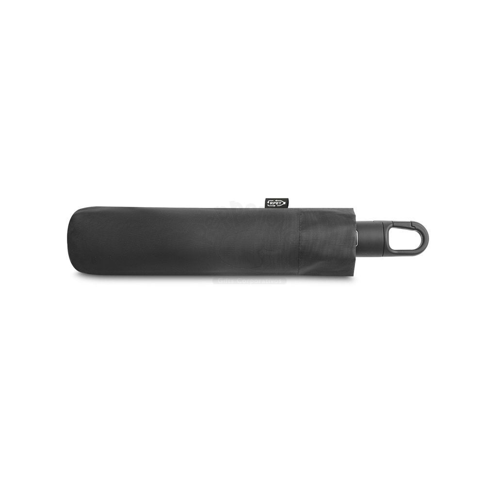 Guarda-chuva dobrável de 23'' em 100% poliéster reciclado pongee 190T (100% rPET). Varetas em fibra de vidro, haste metálica e pega em ABS reciclado (35% reciclado). O guarda-chuva tem abertura e fecho automático, sendo também à prova de vento e dobrável em 3 seções. Fornecido em bolsa.
