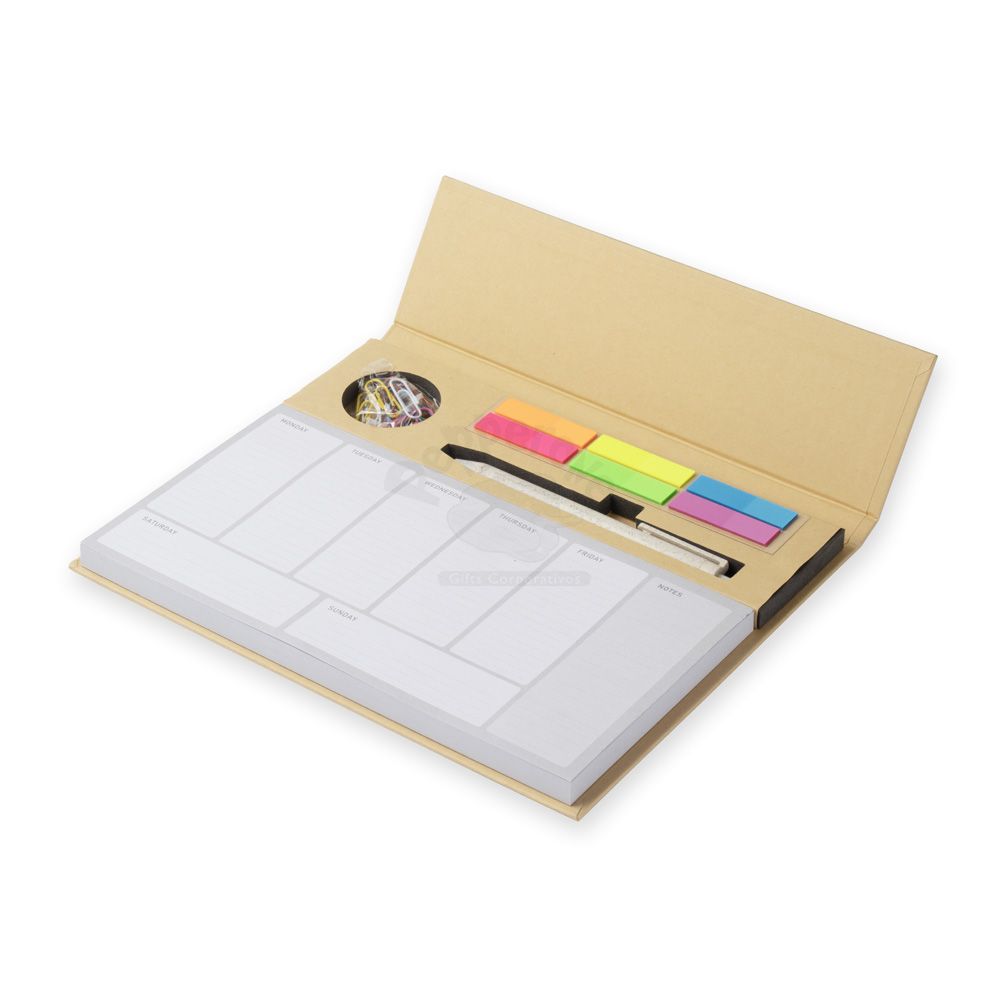 Bloco de anotações em papel Kraft, contendo: bloco de Planejamento Diário com 100 folhas, 6 Sticky notes coloridos, 1 Caneta de Papelão, acompanha clipes coloridos.