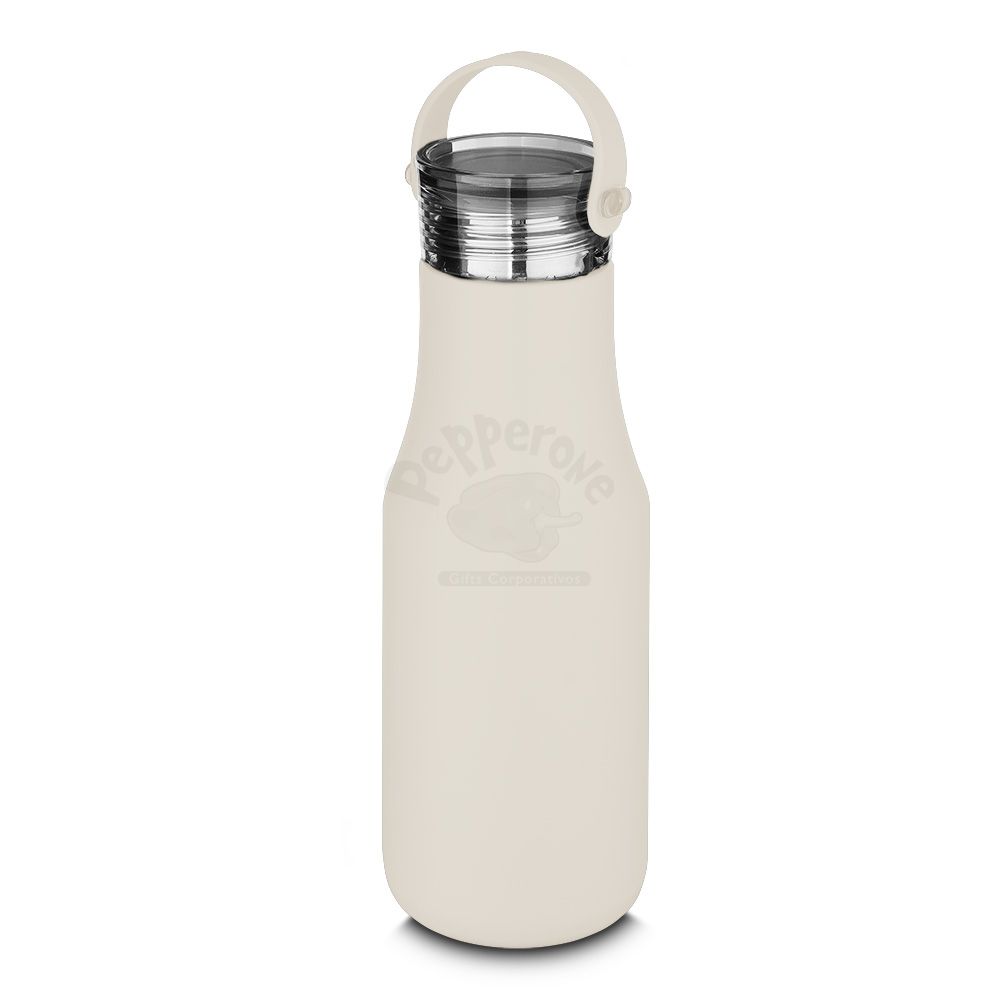 Garrafa térmica em aço inox com parede dupla com capacidade de até 500 ml. Tampa plástica rosqueável, alça em silicone e anel de silicone para vedação.