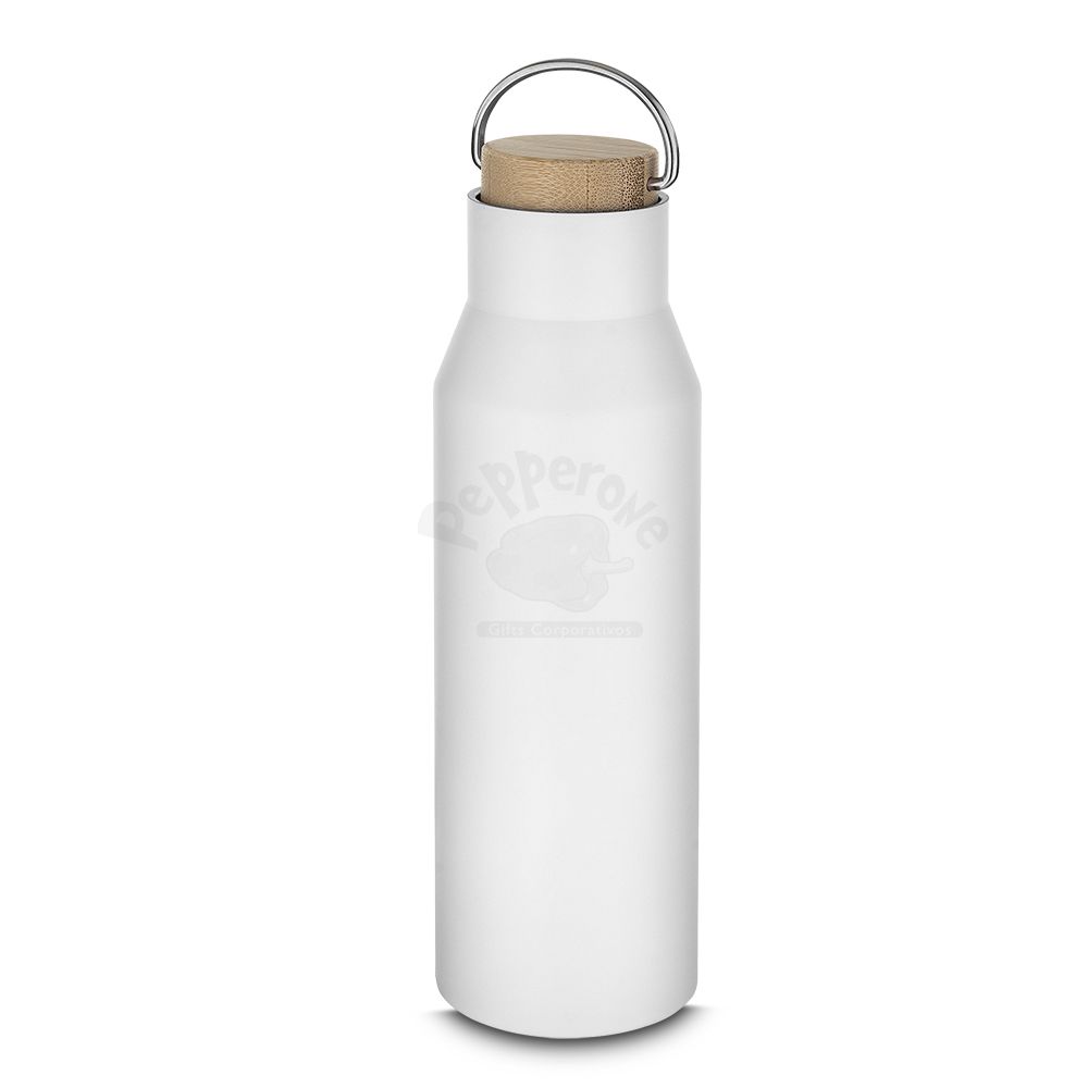 Garrafa térmica em aço inox com parede dupla isolada a vácuo com pintura fosca, com capacidade de até 600ml, tampa com revestimento em fibra de bambu e alça em metal.