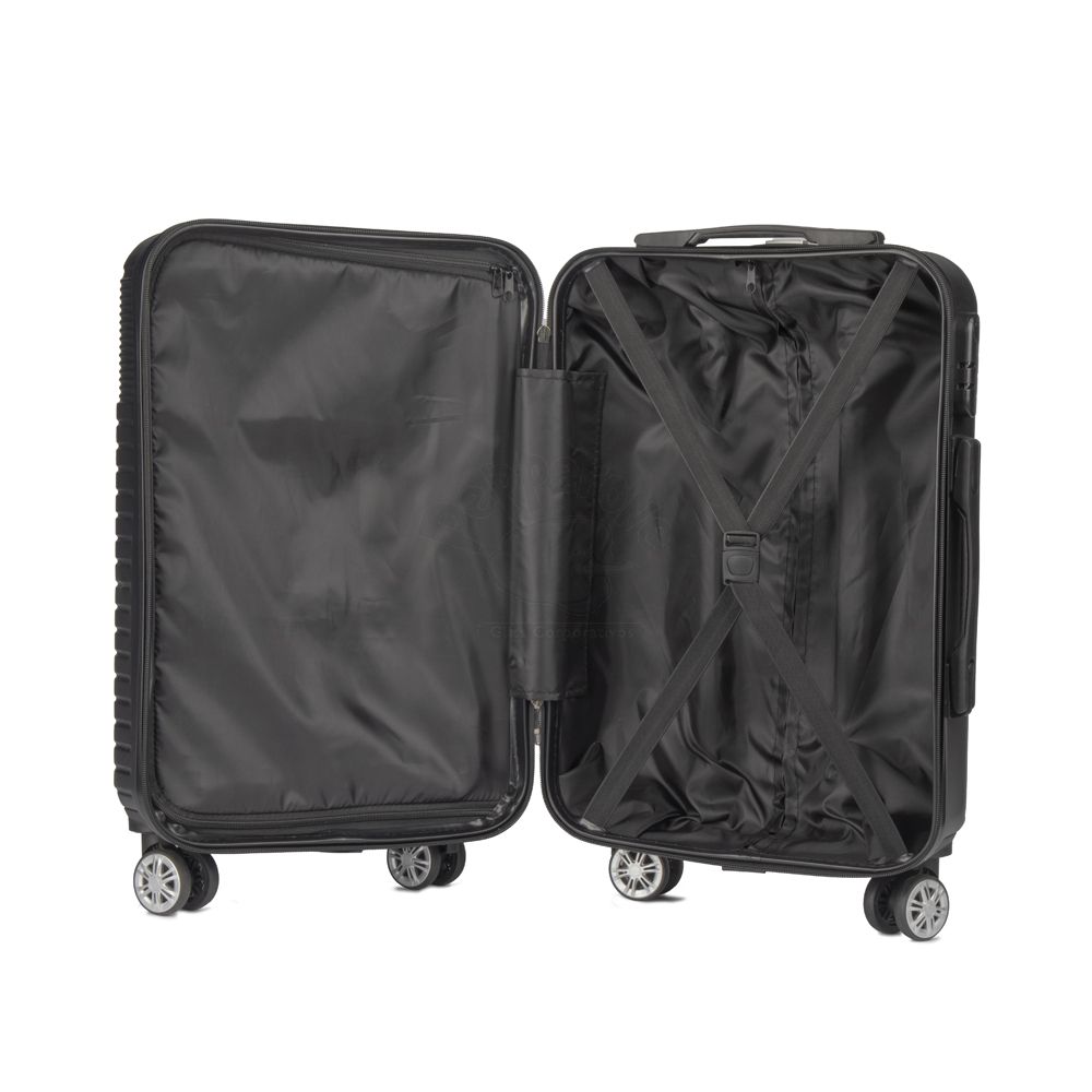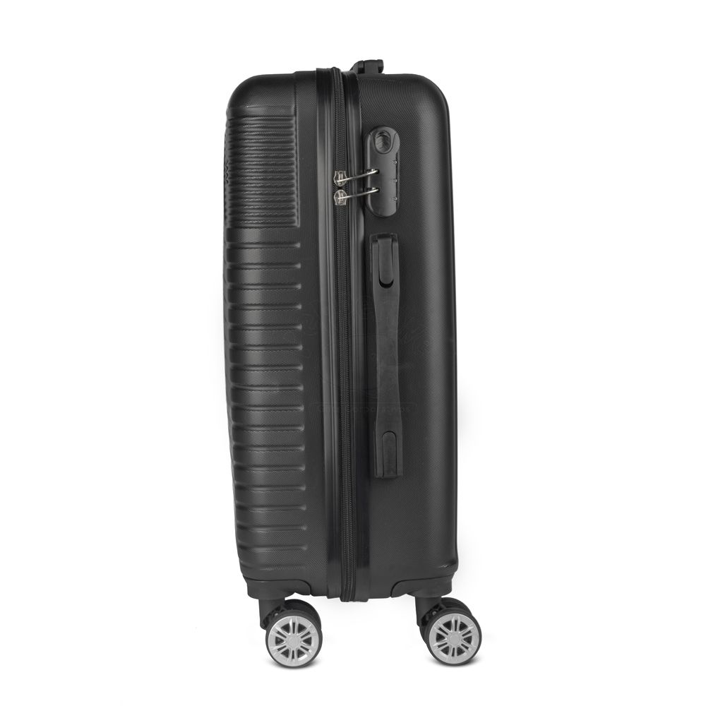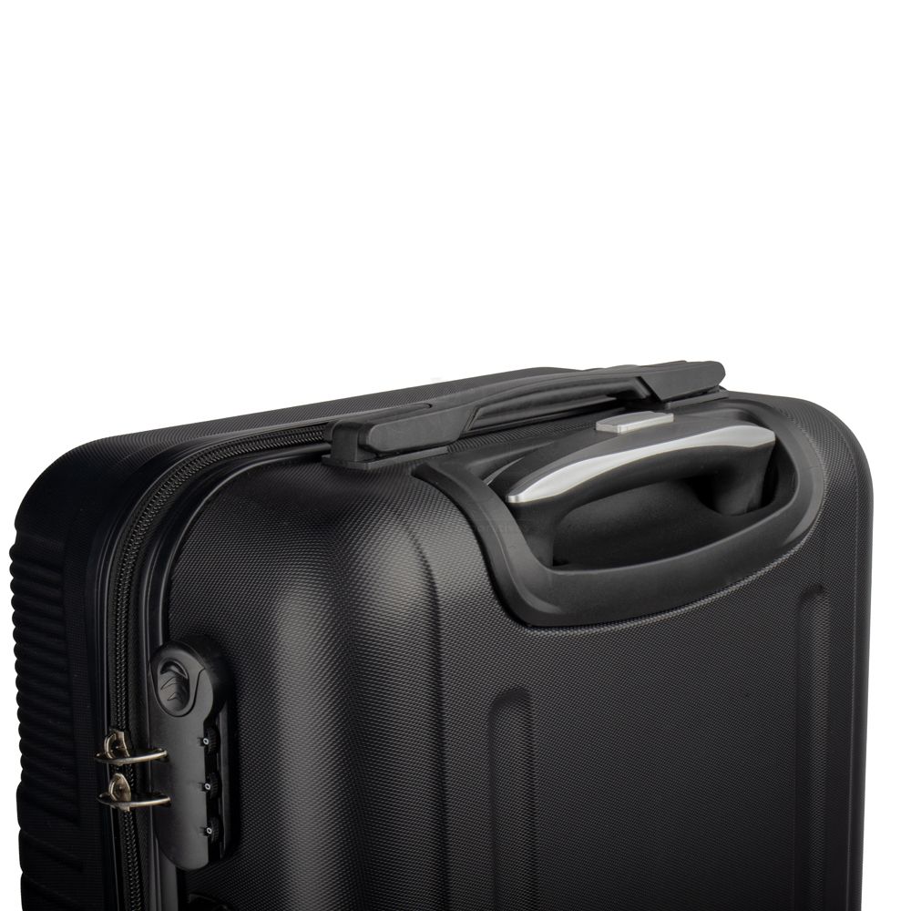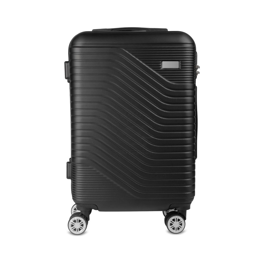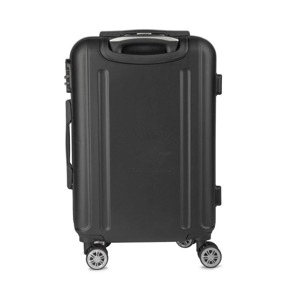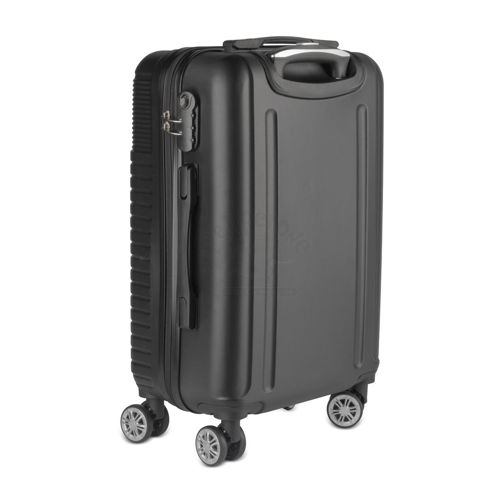 Mala de viagem em ABS possui abertura frontal com zíper para acesso ao interior da mala, cadeado com senha/segredo, sistema de carrinho de aço, alça de mão na parte superior. Acompanha Plaquinha sem personalização.