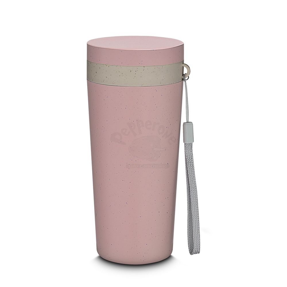 Copo plástico com parede dupla, produzido com fibra de trigo e plástico, com capacidade de 300ml, alça para transporte e tampa rosqueável.
