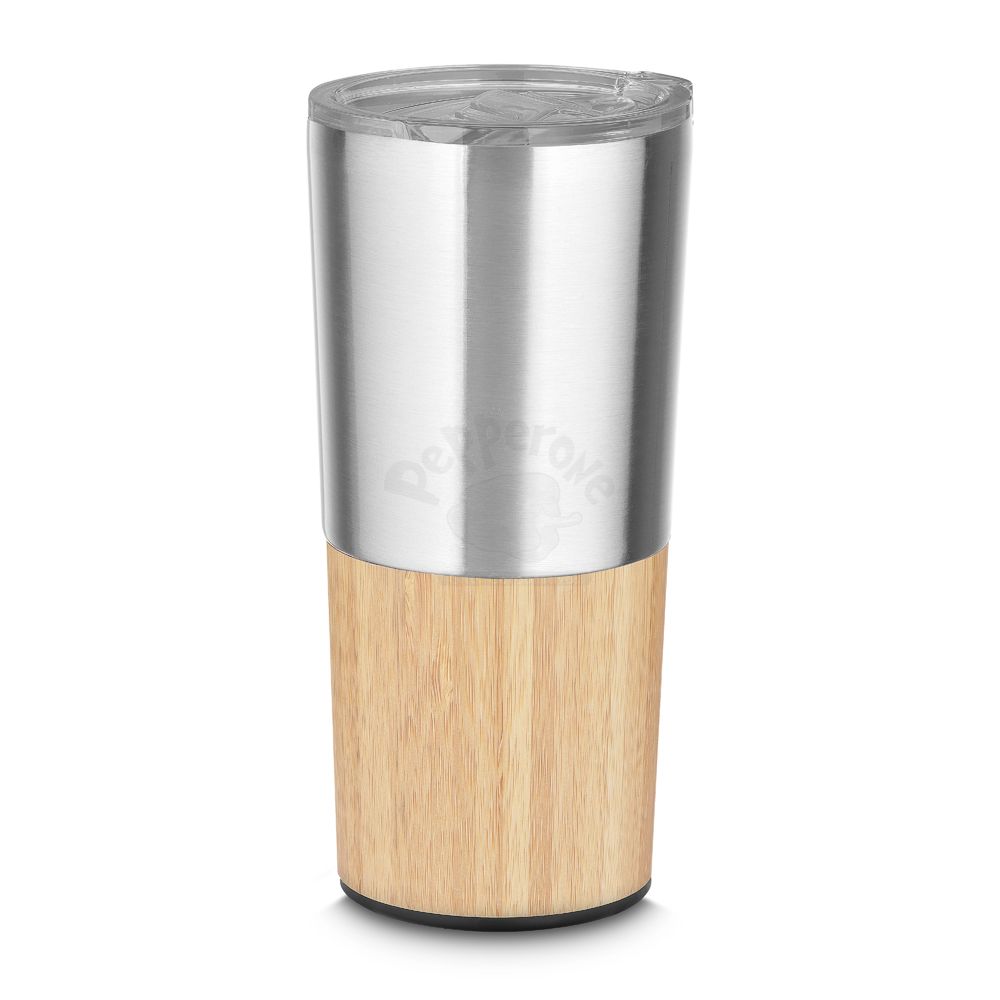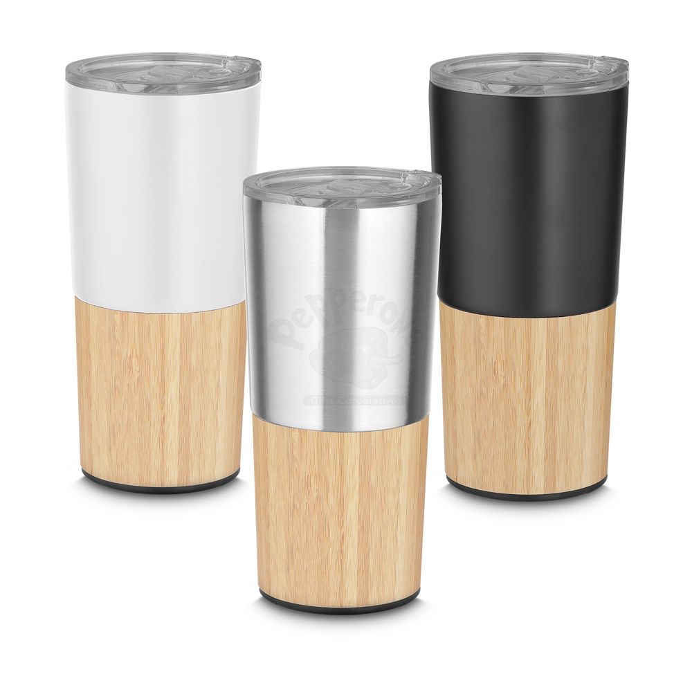 Copo parede dupla em aço inox, detalhe em bambu na parte inferior, tampa plástica com anel de silicone para evitar vazamento, com capacidade de 550ml.