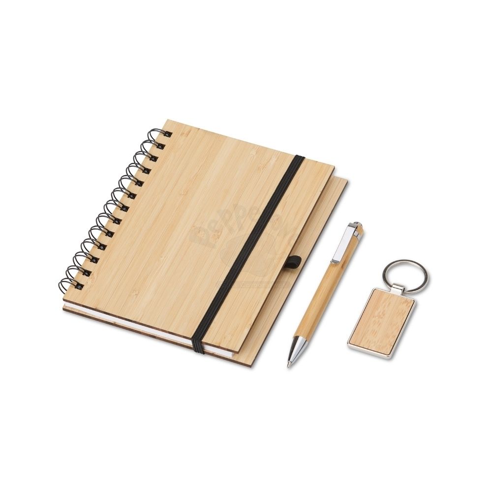 Kit executivo ecológico 3 peças em estojo de papelão. Contém: chaveiro de bambu com detalhe em metal, caderneta em bambu, capa dura, com aproximadamente 65 folhas brancas pautadas, caneta de bambu com clipe metálico, elástico para lacre e suporte para caneta em nylon.