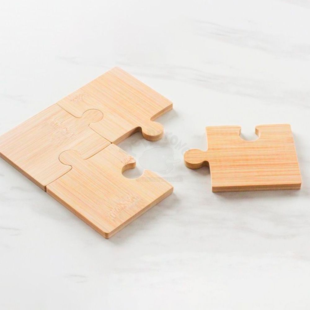 Porta-copos de bambu em formato de quebra-cabeça. Ele todo montado a medida vai para 21x21cm