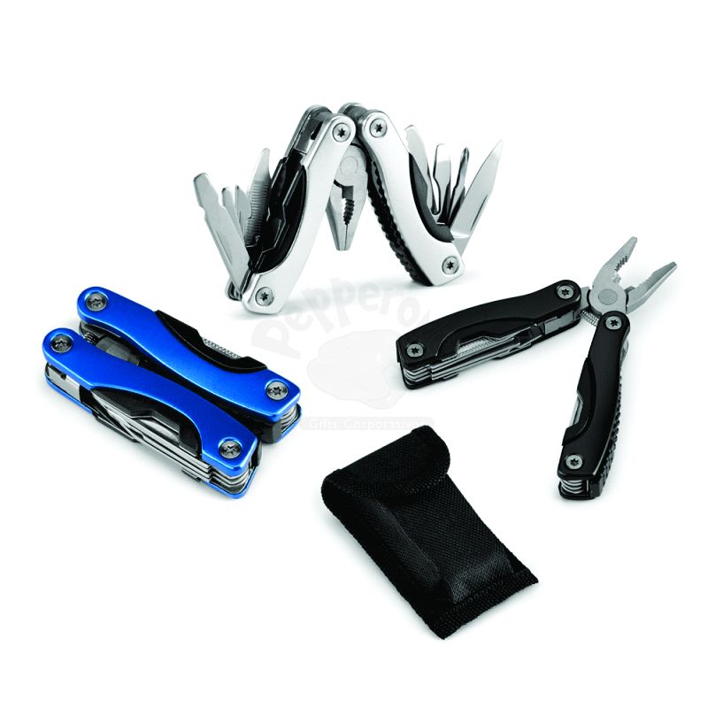 Mini alicate multifunções dobrável em aço inox e alumínio. Incluso 9 funções: alicate, lâmina de serra, 2 abridores, parafuso com a cabeça cruzada, faca, chave de fendas de cabeça plana (grande e pequena) e lima de unhas.