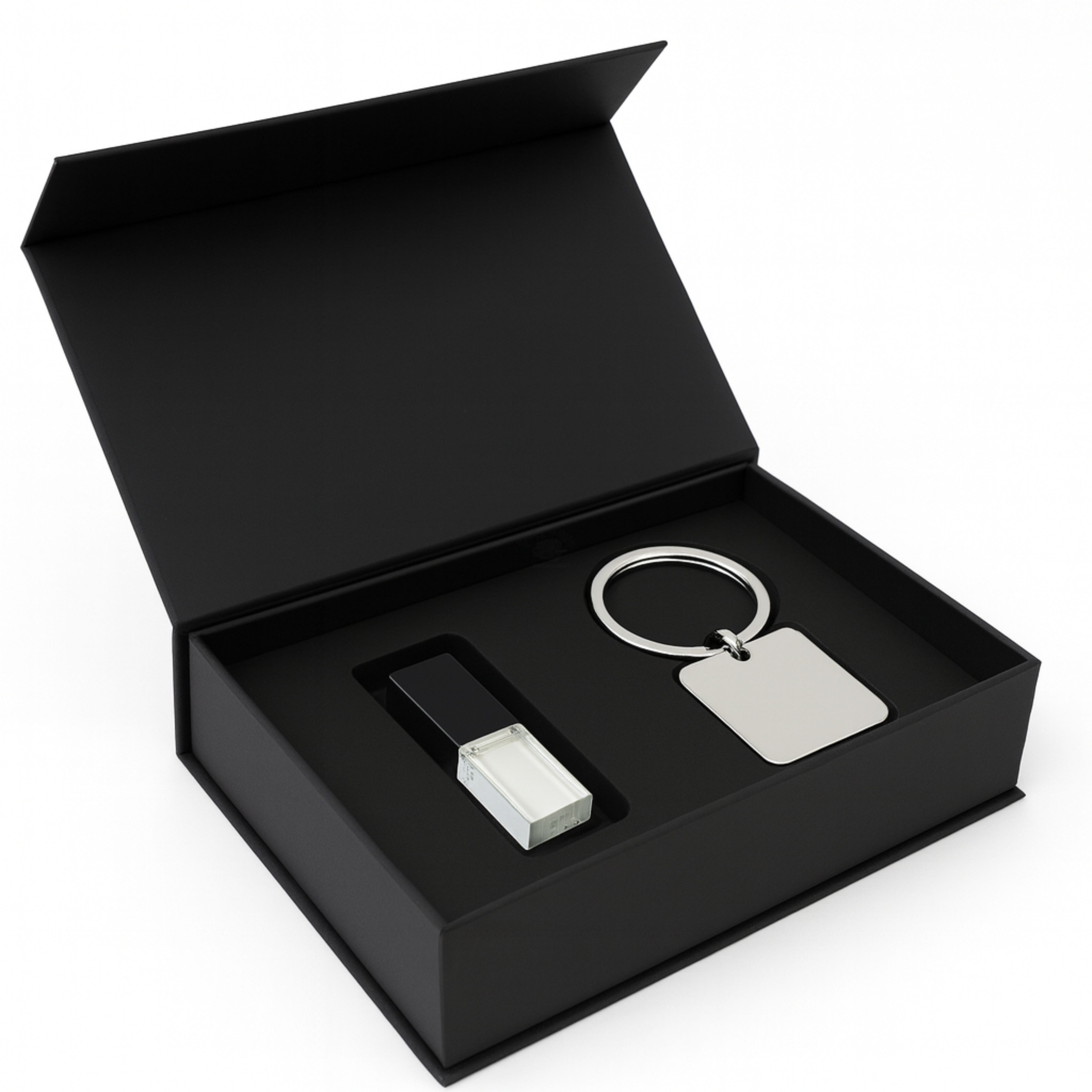 Conjunto composto por Pen drive 4GB/8GB/16GB/32GB/64GB de vidro com tampa plástica prata espelhada e Chaveiro em metal e ABS.
