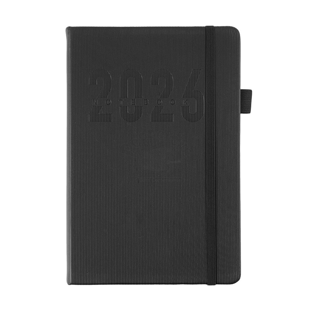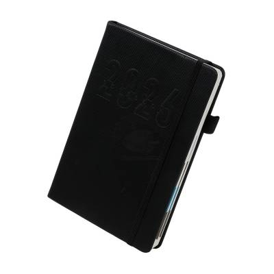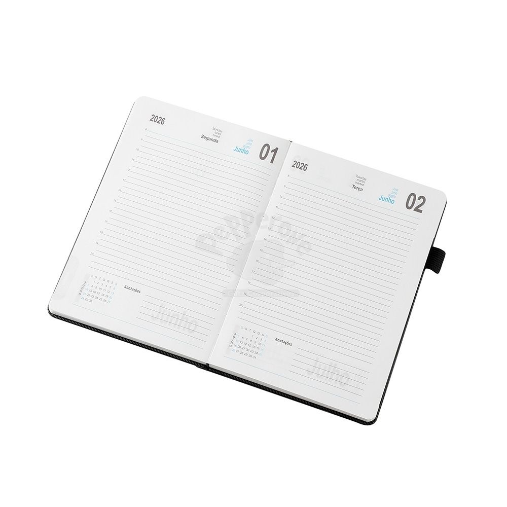 Agenda 2026 com capa dura em poliuretano (PU), marcador de páginas em cetim, porta-canetas e elástico para fechamento. Possui páginas dedicadas a dados pessoais, calendários de 2026 a 2028, lista de contatos e tabelas de pesos e medidas.