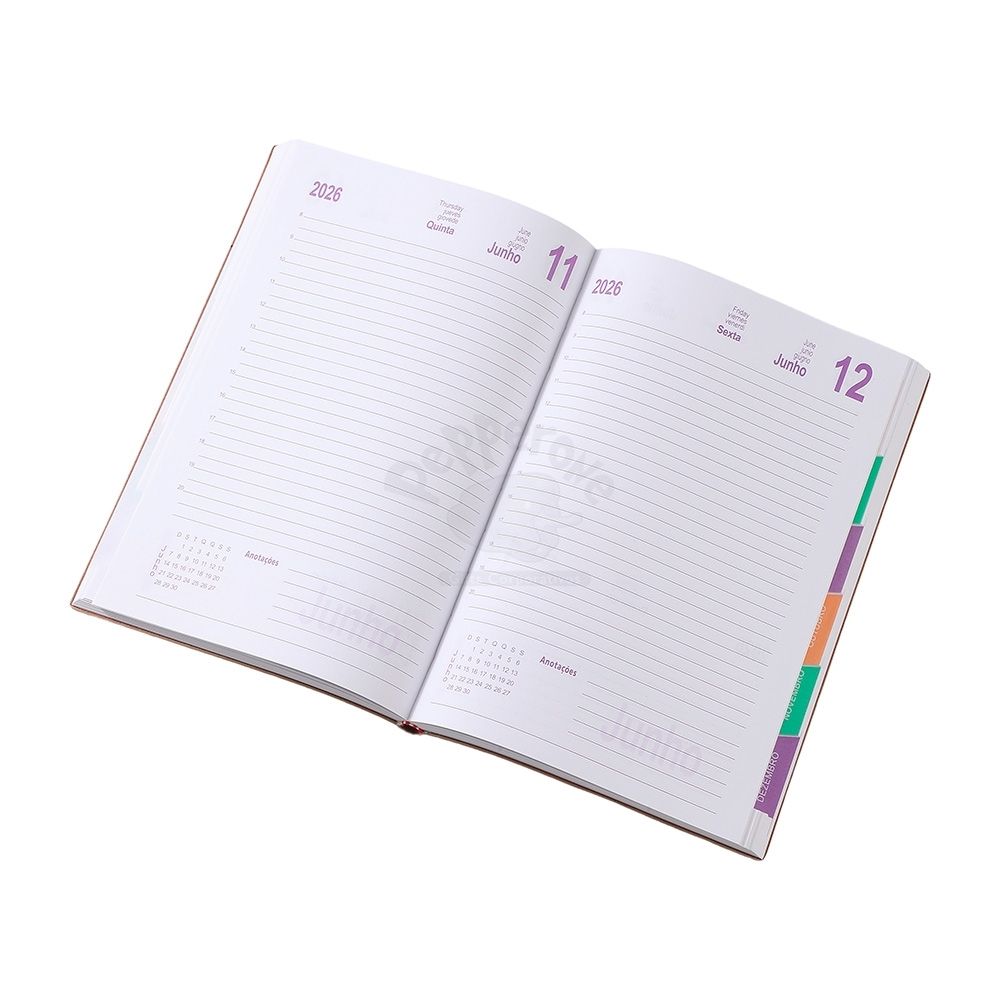 Agenda 2026 de couro sintético com abas mensais e marcador de página em cetim. Contém folhas para dados pessoais, calendários 2026 à 2028, planejamento 2026, DDI, página de conversões e páginas de contatos.