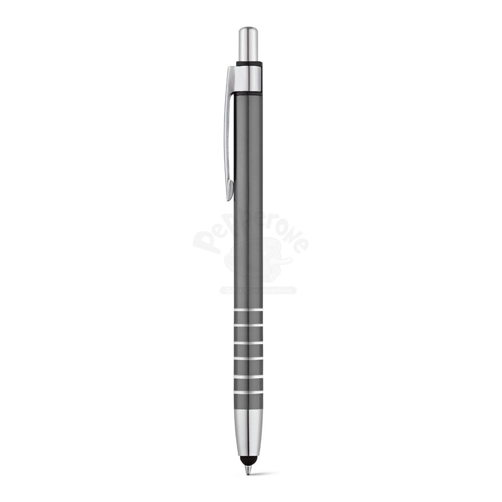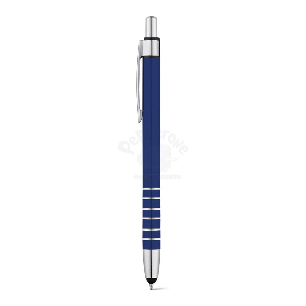 Esferográfica em alumínio com ponteira touch e clipe de metal. Escrita em azul até 1,5 km.