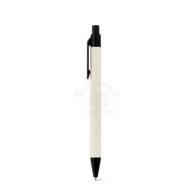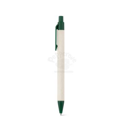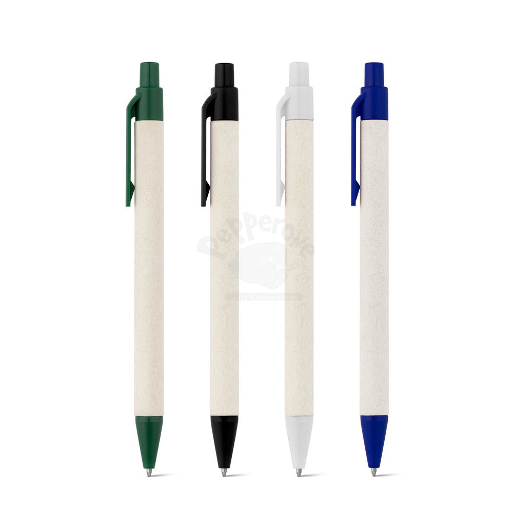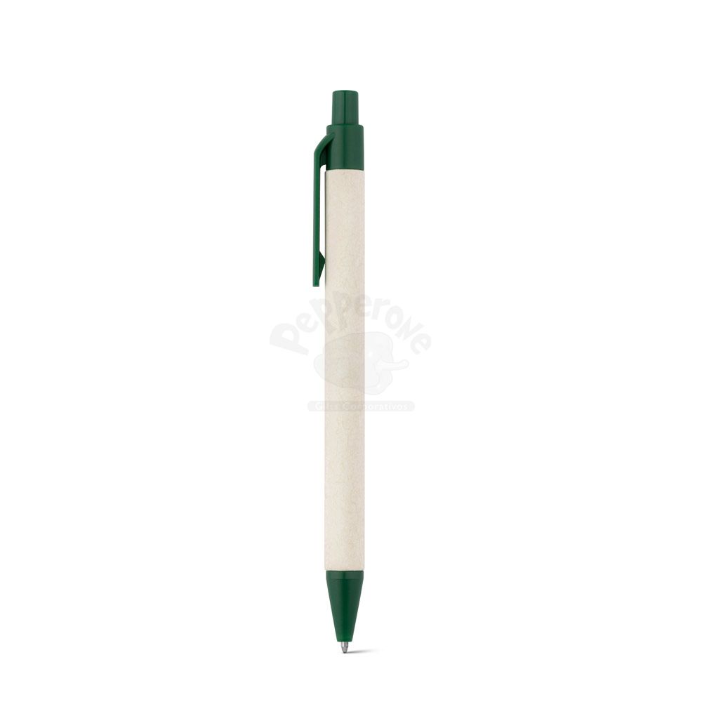 Esferográfica produzida através de pacotes de leite reciclados, contribuindo para o reaproveitamento do cartão e alumínio. Corpo em cartão e componentes coloridos em ABS 100% reciclado. Escrita em azul até 1,5 km.