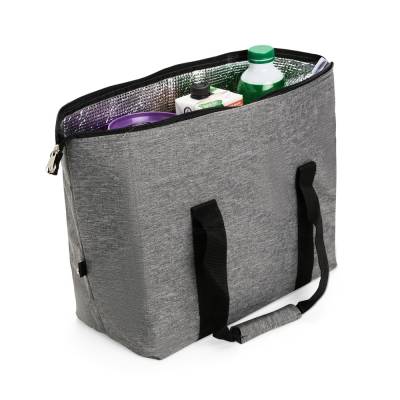 Bolsa térmica confeccionada em Oxford resistente à água, fechamento em zíper e capacidade de até 25 litros. Possui revestimento térmico interno em folha de alumínio, botões laterais de metal para junção, bolso externo e alças de mão em nylon com suporte de união por velcro.