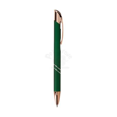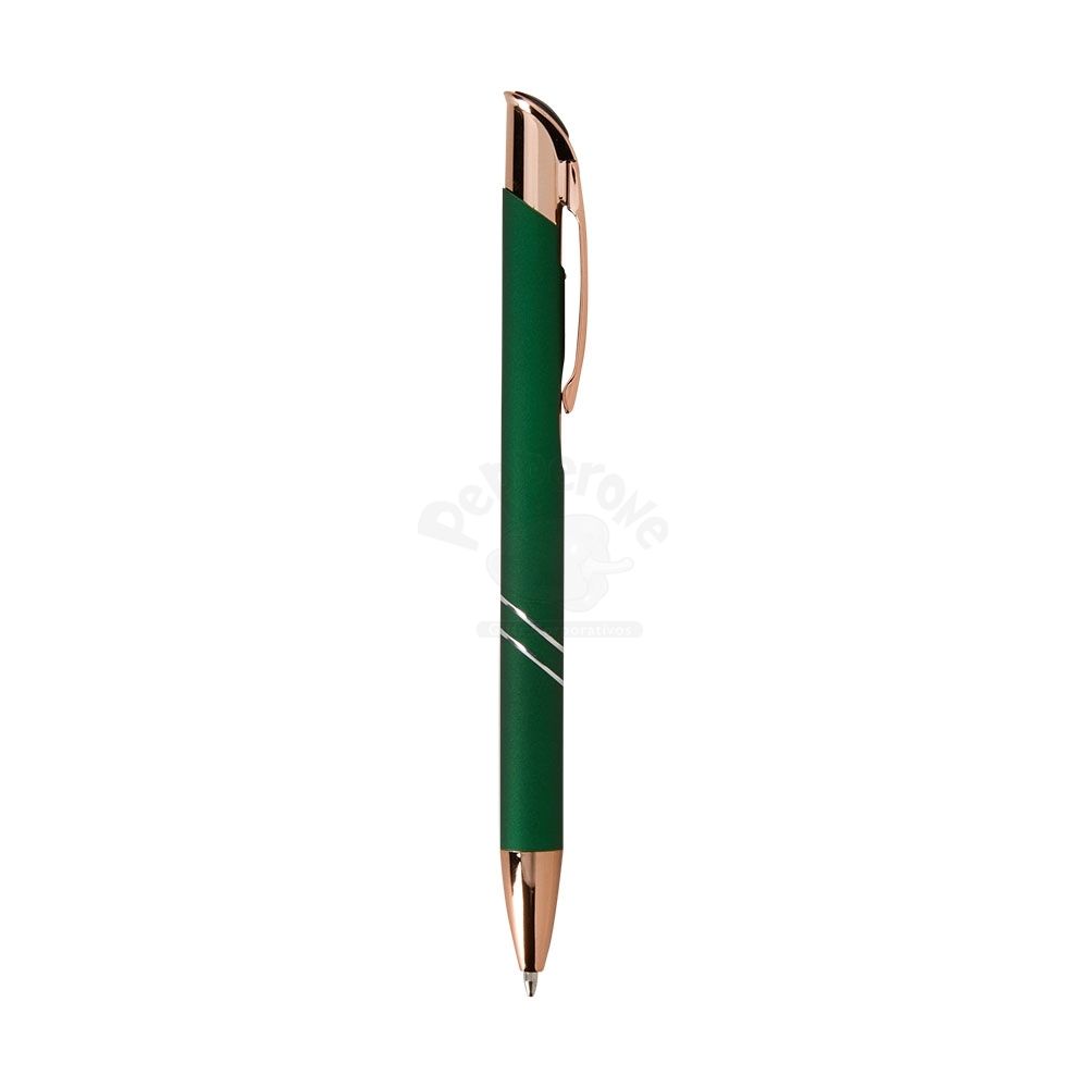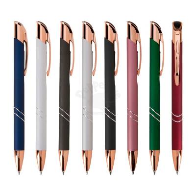 Caneta metálica com detalhes em plástico, acionamento por clique e carga esferográfica azul de 1.0mm, o que proporciona uma pegada leve e uma escrita precisa.