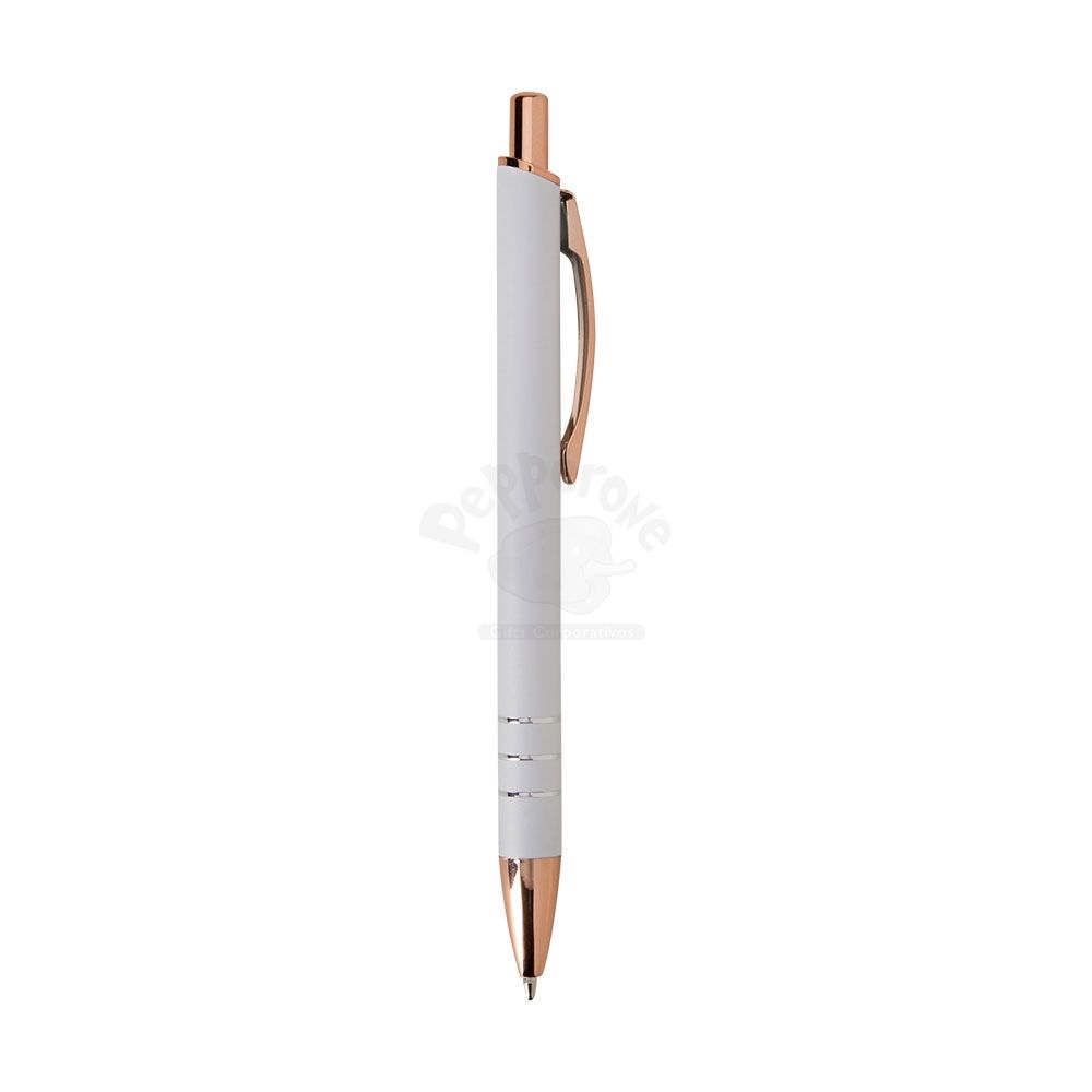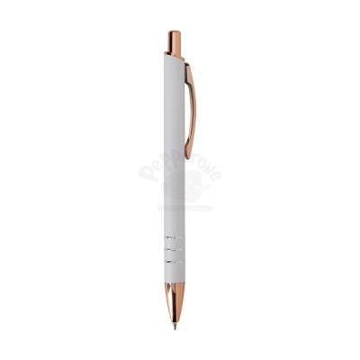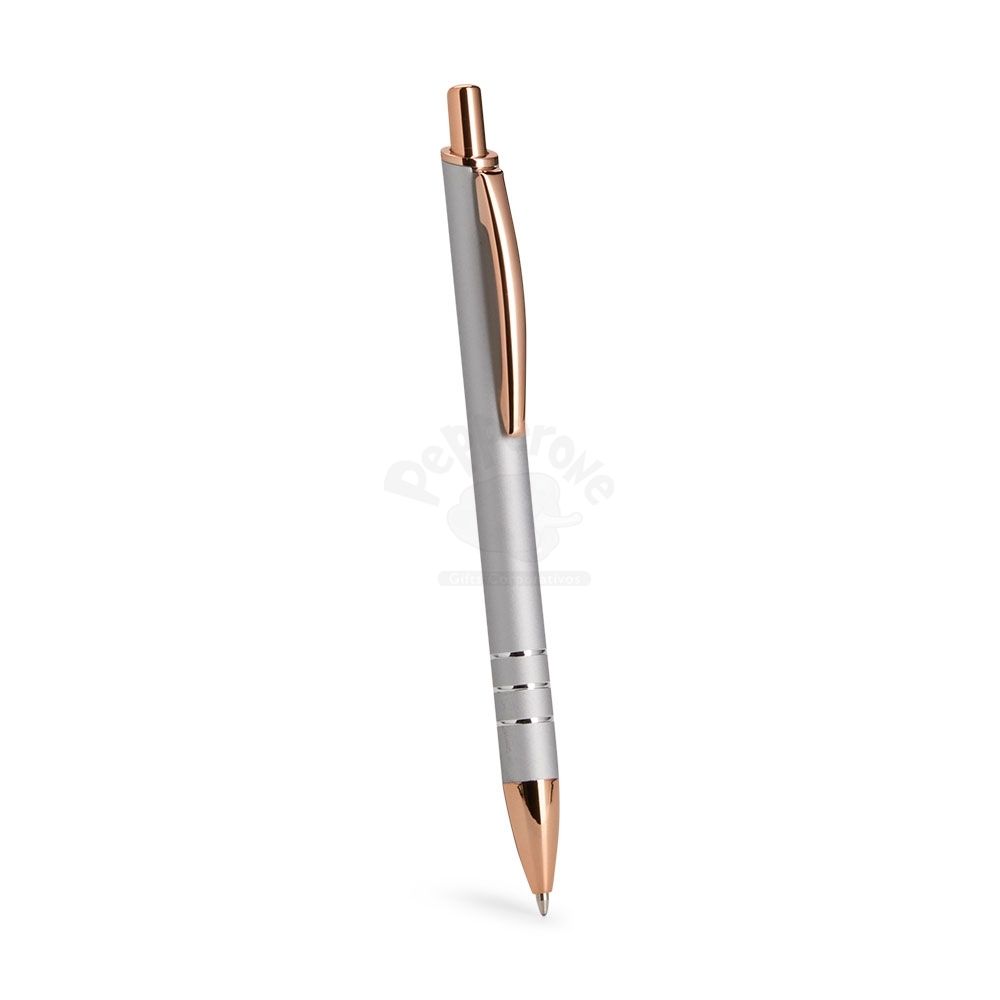 Caneta metálica com acionamento por clique e carga esferográfica azul de 1.0mm, uma combinação que oferece pegada leve para uma escrita mais precisa.