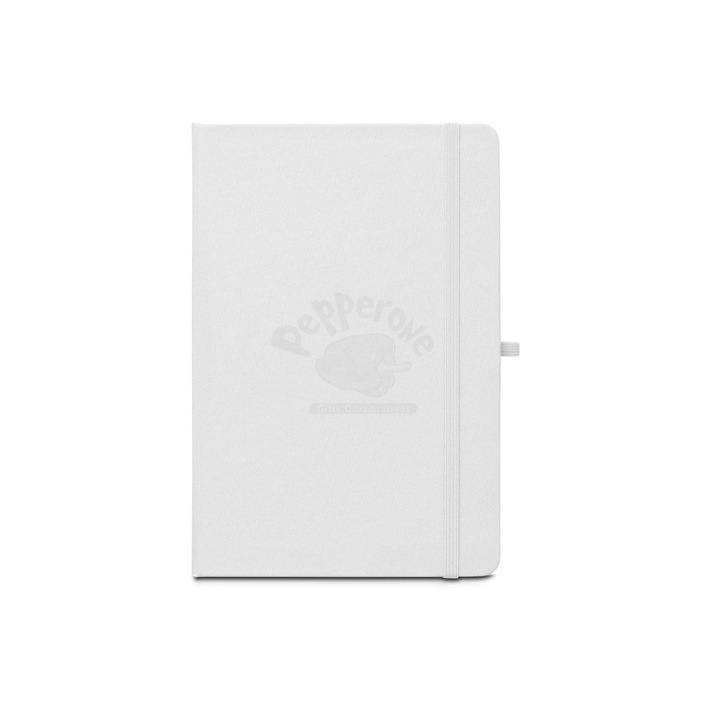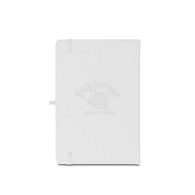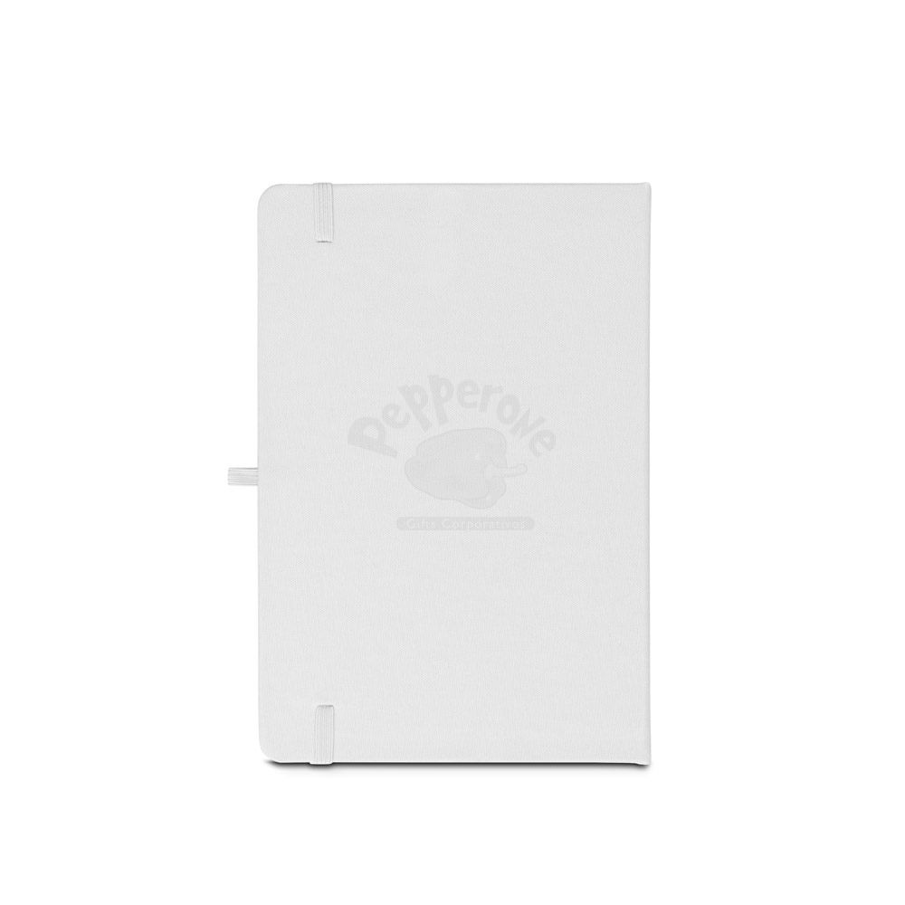 Caderno A5 de capa dura, ideal para personalização em sublimação. O caderno em poliéster 100% reciclado (rPET) 300D tem 160 páginas pautadas em papel 100% reciclado cor de marfim, uma fita separadora, um suporte para esferográfica (não inclusa) e um elástico para fecho do bloco.