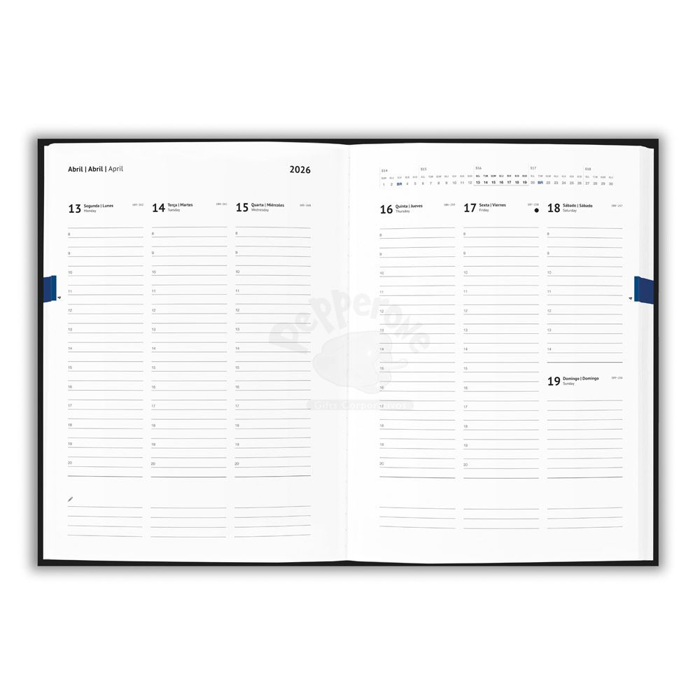 Agenda B5 em pele reciclada (58%) com fecho magnético. Está organizada num plano semanal. Inclui suporte para esferográfica (incluída) e marcador em fita. Fornecida com bolsa de non-woven.