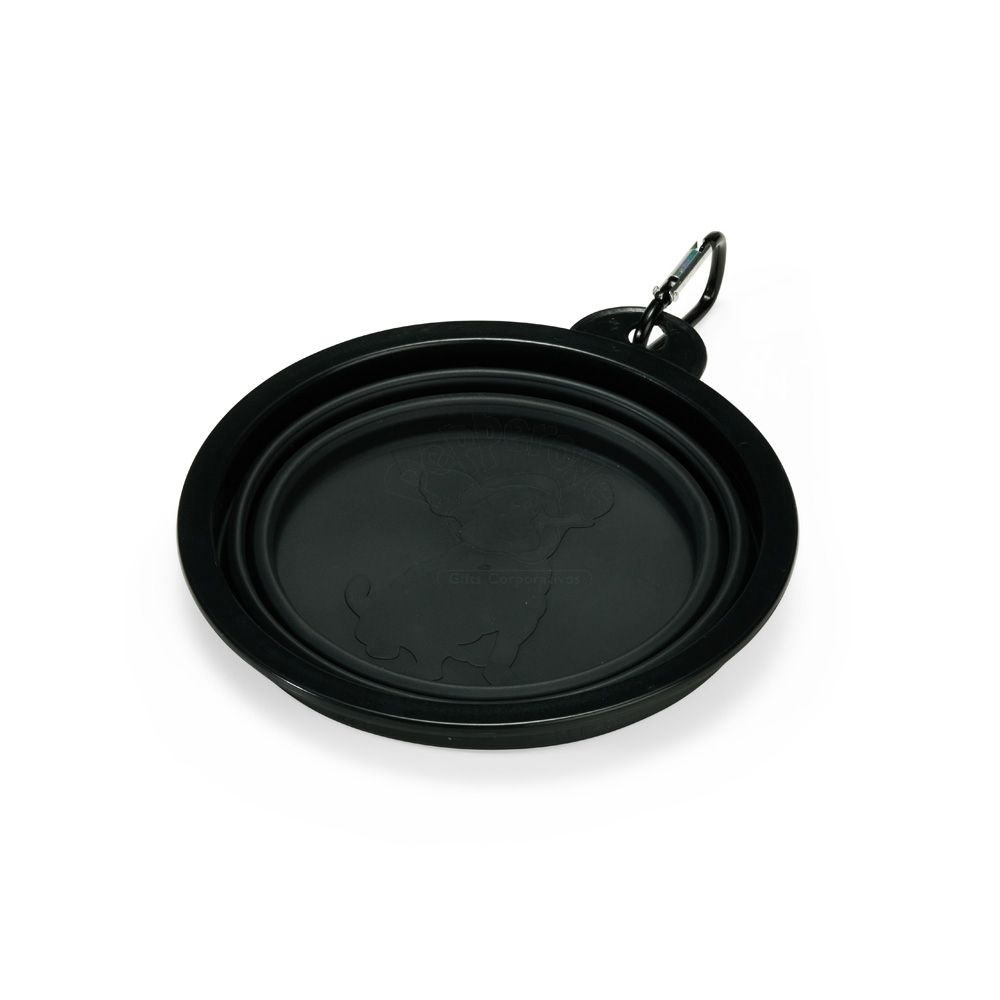 Tigela retrátil para pets feita em silicone com borda plástica equipada com encaixe para mosquetão e capacidade de até 350ml. Acompanha mosquetão metálico para facilitar o transporte.