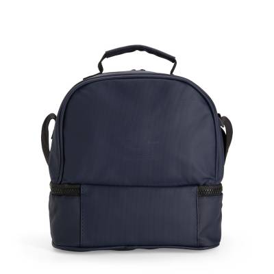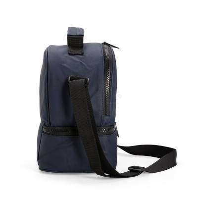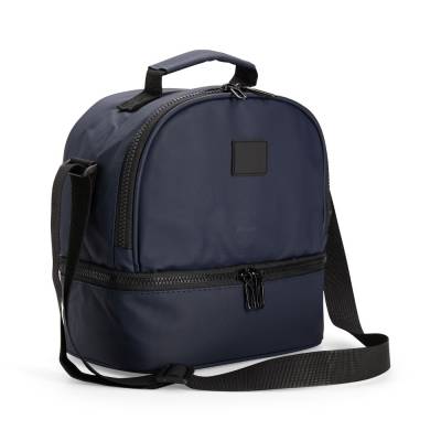 Bolsa térmica confeccionada em poliéster mesclado com PVC impermeável, fechamento em zíper e capacidade de até 7 litros na soma de seus dois compartimentos térmicos individuais revestidos em PEVA atóxico. Conta com placa emborrachada para personalização, uma alça de mão e alça transversal.