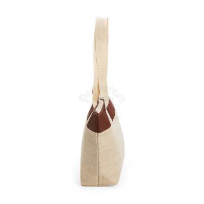 Bolsa térmica confeccionada em juta e detalhe em bidim, fechamento em zíper e capacidade de até 12 litros. Possui revestimento térmico em folha de alumínio e um par de alças fixas.