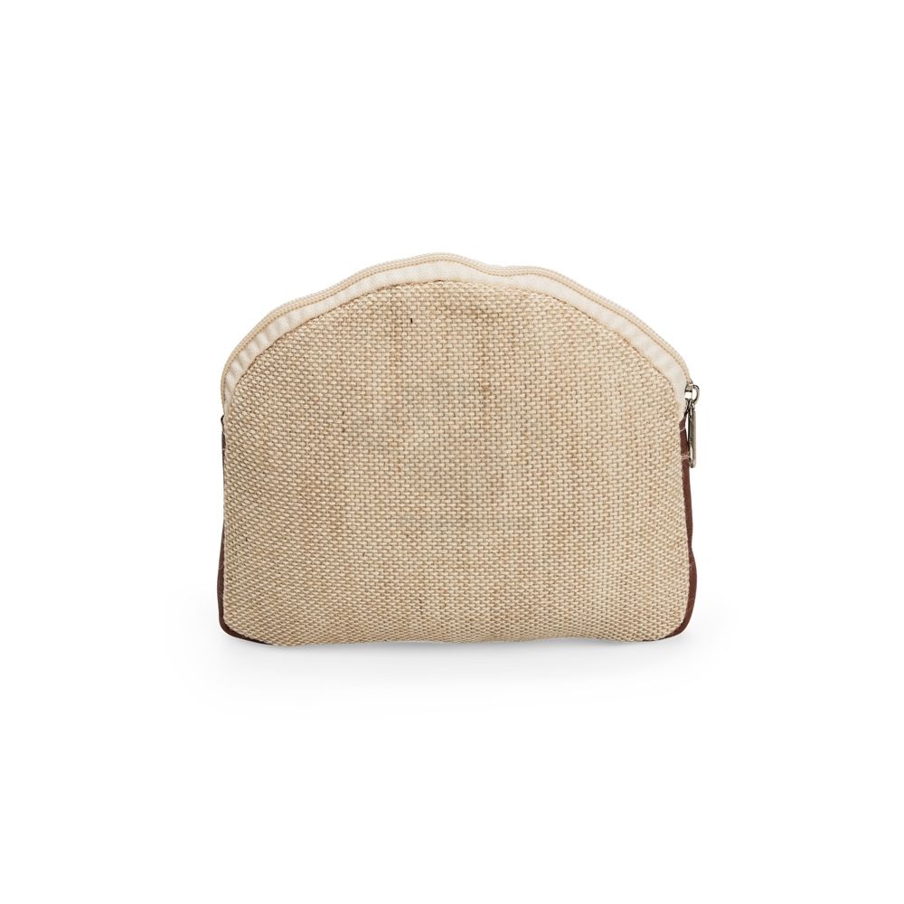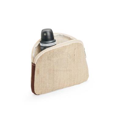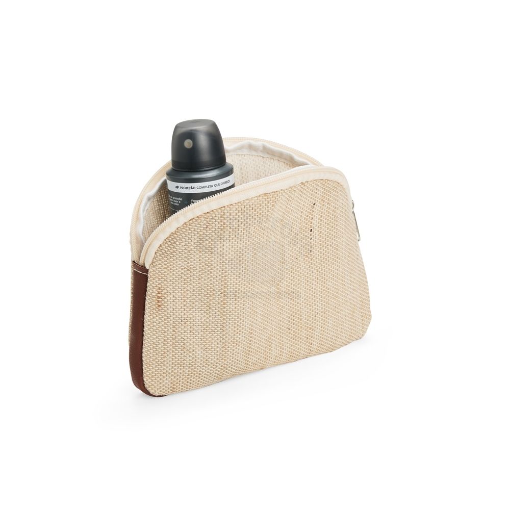 Nécessaire confeccionado em juta com fechamento em zíper e detalhes laterais em bidim.