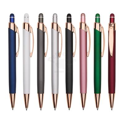 Caneta metálica com carga esferográfica azul de 1,0mm e acionamento por clique de revestimento emborrachado para interação em dispositivos com telas sensíveis ao toque.