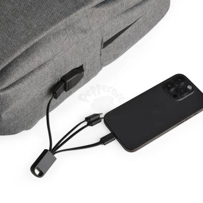 Mochila confeccionada em nylon Oxford impermeável, com fechamento em zíper, puxadores com detalhes em nylon e plástico e capacidade de até 14 litros. Possui compartimento interno principal com bolsos de tamanhos variados e divisória para notebooks de ate 15,6 polegadas. Possui três compartimentos externos, um deles com abertura lateral. Dispõe também de bolso lateral, porta USB, alça de mão em poliéster 210D e alças para as costas em tecido respirável.