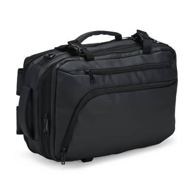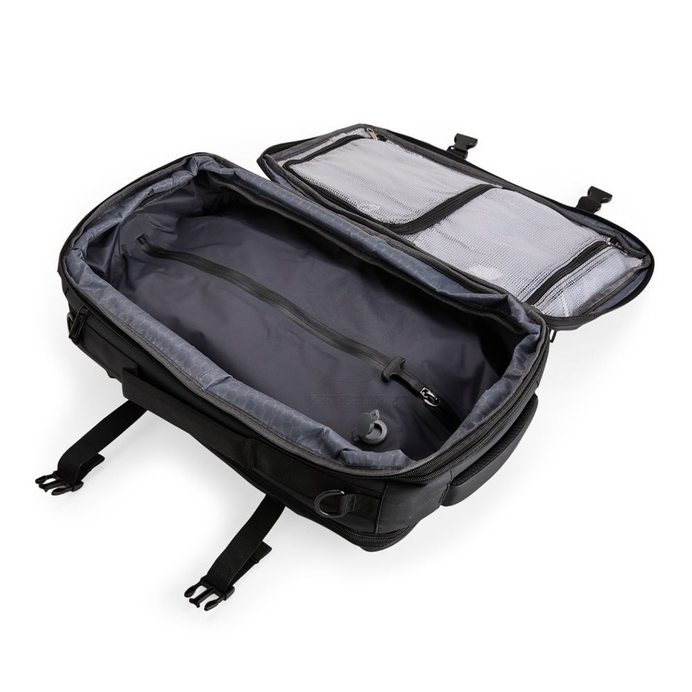 Mochila em nylon com uma camada de PU impermeável com capacidade máxima de 28 litros. Possui um compartimento interno a com sistema de vedação vácuo para guardar roupas e outros objetos (bomba compressora não incluído) e duas divisórias em poliuretano termoplástico de tamanhos diferentes, além de bolsos frontais, um lateral em tela e outro traseiro com divisória para notebook de até 15,6 polegadas. Dispõe ainda de alças acolchoadas em espuma respirável, uma alça lateral para transporte horizontal e outra para ombro ajustável em nylon.