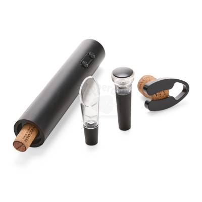 Kit vinho com cinco peças, incluindo: saca-rolhas em plástico e aço carbono com acionamento por botões alimentado por quatro pilhas AA (não inclusas), bico dosador e rolha em plástico e borracha TPR, cortador de lacre e base em plástico.
