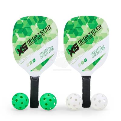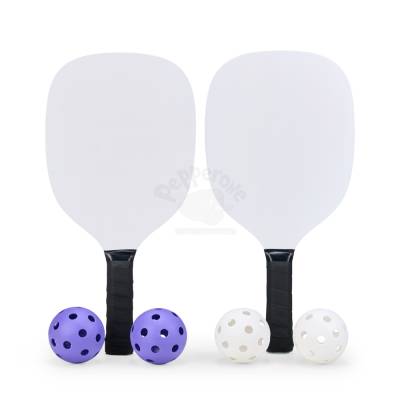 Kit Pickleball com duas raquetes de madeira (sendo uma face personalizada e outra lisa) com grip composto em fibras de carbono e vidro e quatro bolas plástica com 26 furos. Acompanha bolsa de nylon com alça de mão e visor plástico transparente.