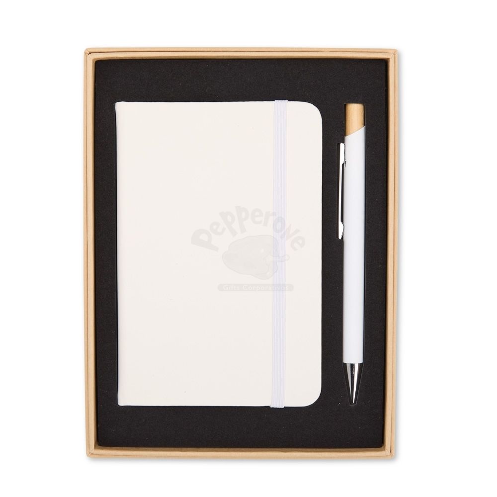 Kit executivo composto por uma caderneta e uma caneta. A caderneta possui capa dura em couro sintético, marca-páginas em fita de cetim e elástico para fechamento, além de aproximadamente 80 folhas com pauta. Por sua vez, a caneta metálica conta com detalhe em bambu, acionamento por clique e carga esferográfica azul de 1,0mm. Acompanha uma caixa de papelão com berço interno em espuma.