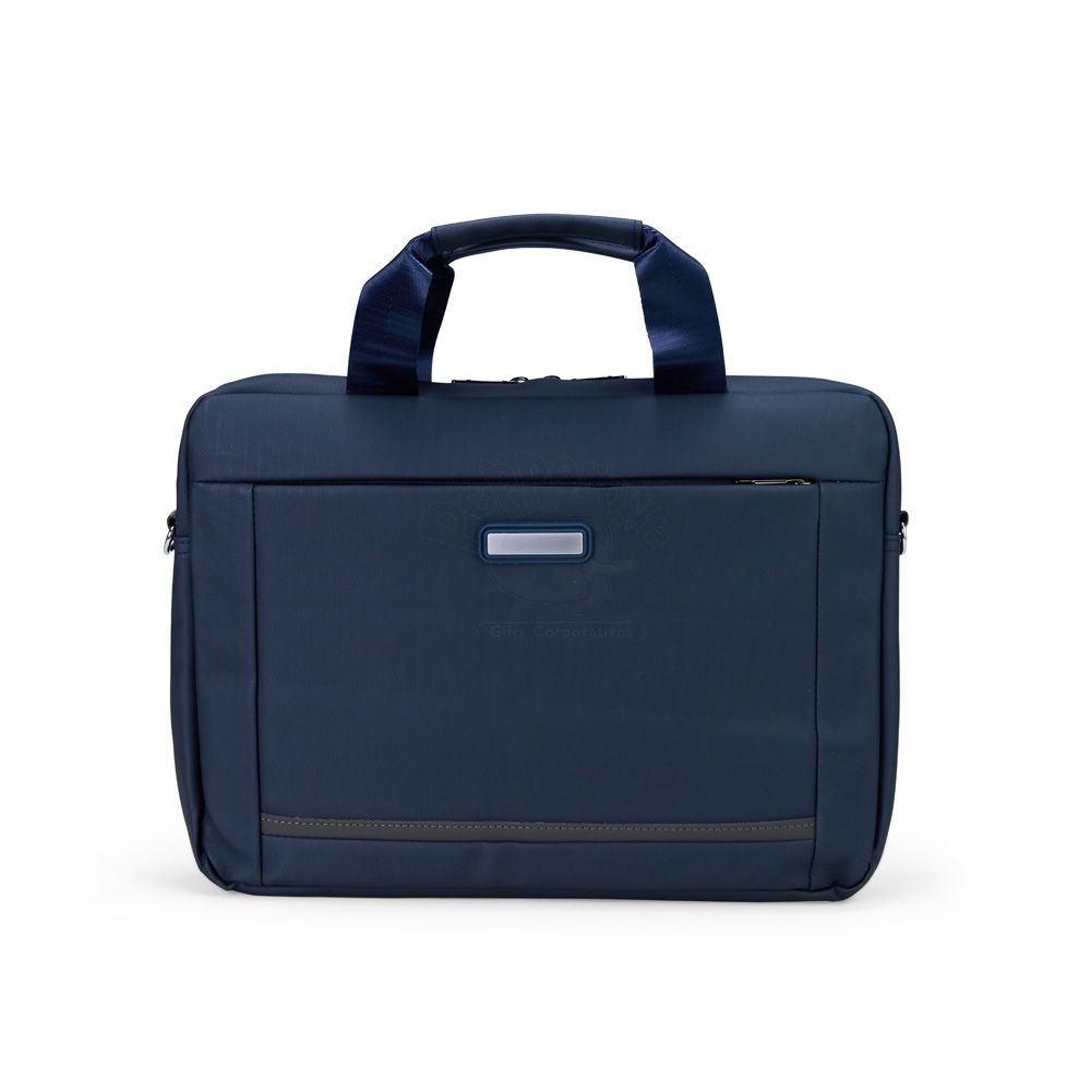 Pasta para notebook confeccionada em couro sintético impermeável com fechamento em zíper e capacidade para aparelhos de até 15,6 polegadas. Possui dois compartimentos: o principal, com revestimento acolchoado, quatro bolsos abertos de tamanhos diferentes e duas divisórias para canetas; e o frontal, com plaquinha metálica fixa na parte externa. Conta ainda com duas alças de mão e um par de abas metálicas para alças removíveis. Acompanha alça de ombro ajustável.