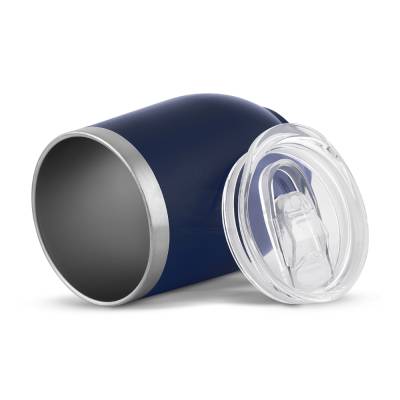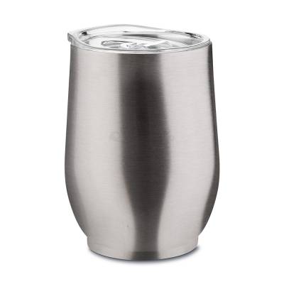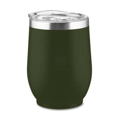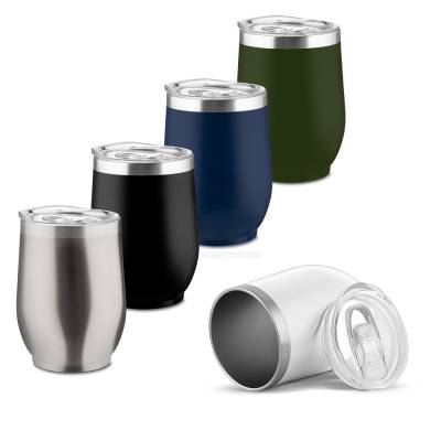 Copo térmico em aço inox com parede dupla, pintura fosca, detalhe em aço inox, tampa plástica com anel de silicone para vedação, abertura na tampa para consumo, capacidade de 350ml.