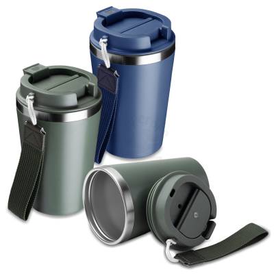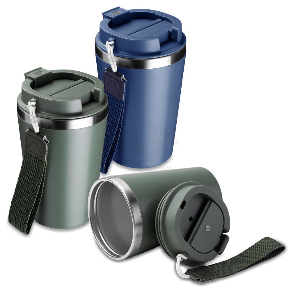 Copo de 350 ml com parede dupla, interior em inox 304 e exterior em plástico PP, tampa em plástico PP, alça de mão e acabamento com pintura fosca.