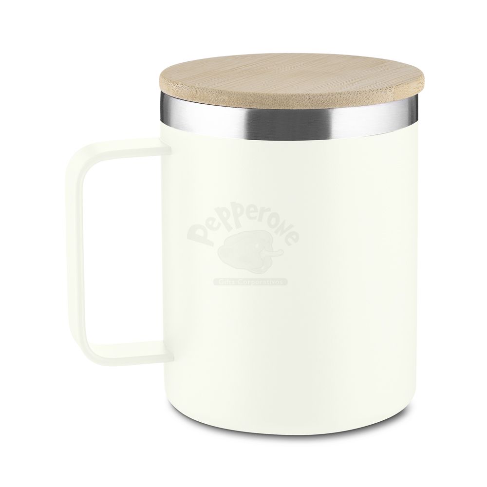 Caneca térmica 400ml, produzida em inox reciclado (304 interno / 201 externo), com tampa em bambu, pintura a pó.